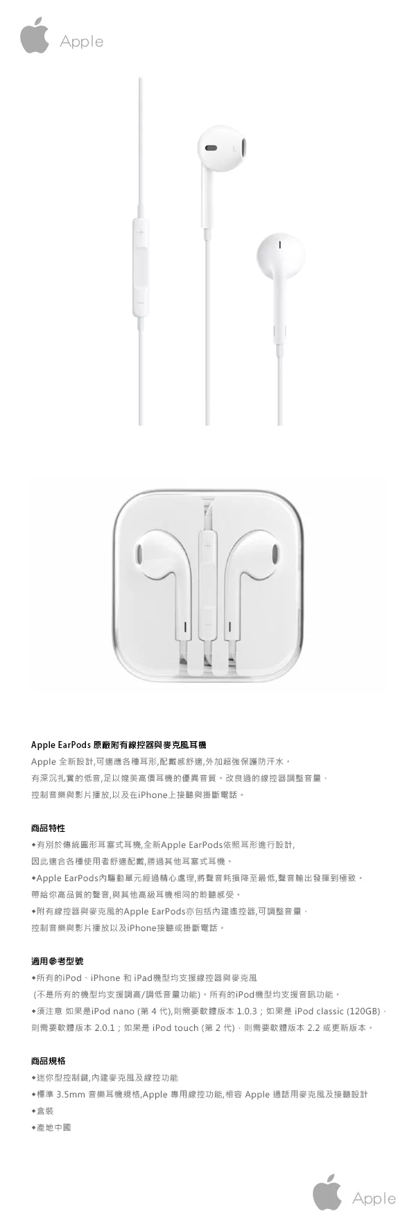 Apple 原廠 iPhone-iPad-iPod 專用 EarPods 線控耳機 (密封袋裝)單色